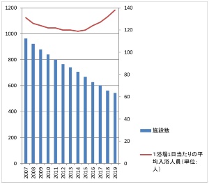 そうですね。戦後のピーク時に2600軒以上あった東京の公衆浴場(銭湯)数は、その後、右肩下がりで減り続け、現在ではその4分の1の500軒あまりにまで減っています。一時は毎週1軒ずつ減るようなペースでしたが、昨年はその減り方がゆるやかになりました。また、延べ利用者総数としても下げ止まったとは言いませんが、ほぼ横ばいの状態になってきました。 そうした中、1日1浴場当たりの平均入浴者数が上向きに転じてきました。1日1 浴場当たりの平均入浴者数はだいたい120人ほどでしたが、130人から140人近くまで増えてきています。これは過去50年間ほどなかった動きです。中には500人、1000人という銭湯も現れています。