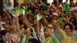 「皆さんのお一人お一人の力で、私を一段一段と上にあげてください」と言う時、彼女は「お一人お一人」と言いながら右手の人差し指を1本立て、相手に押し付けるようにしっかりと振りました。さらに「一段一段」と言いながら、今度は手のひらで段を作りました。